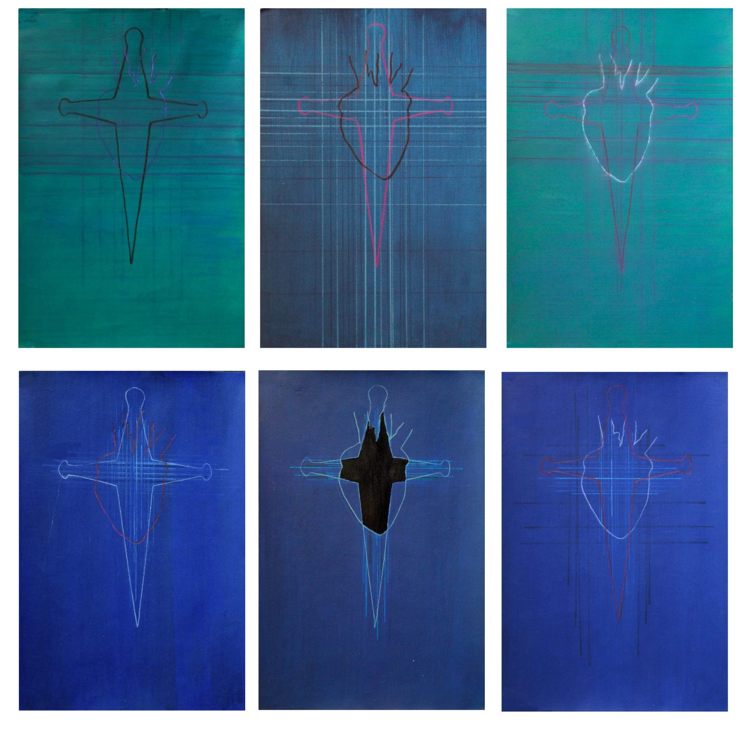 CATEDRAL IV. Acrílico sobre tela. Dos piezas de 146×89 cm.CATEDRAL III. Acrílico sobre tela. 100×73 cm.CATEDRAL I. Acrílico sobre tela. Dos piezas de 130×97 cm.CATEDRAL II. Mixta sobre papel montado sobre tabla. 100×193 cm